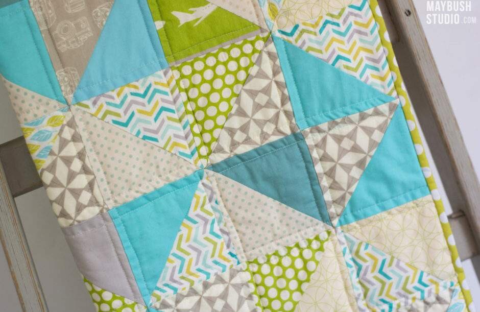 Опять вырезаем по квадрату из двух разных тканей. Складываем их лицевыми сторонами и прокладываем строчку по периметру, отступив от края на ширину 1/4″. Затем разрезаем квадрат по обеим диагоналям.