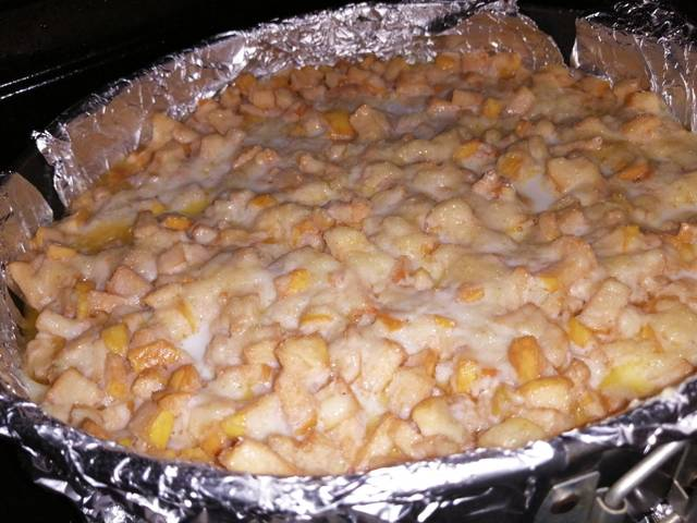 Я бы назвала 4 стакана, тогда уж💕. Смотри готовый пирог в шагах. Ингредиенты Как приготовить Яблоки натереть на крупной тёрке. У меня были яблоки немного мягковатые(заготовка с лета), поэтому нарезал мелким кубиком. Все сухие ингредиенты смешать. Молоко с маслом растопить. На дно формы высыпаем 1/5 часть сухого *теста*. Затем 1/3 яблок, затем *тесто*, затем яблоки. Получится 5 слоев *теста* и 3 слоя яблок. Заливаем молочной смесью. Прокалываем шпажкой или ножом во всех местах. Отправляем в разогретую духовку при 180" минут на 40. Приятного аппетита. источник