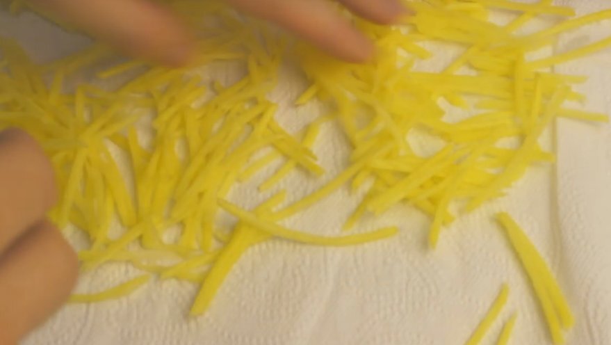 Всем привет! Предлагаю к вашему вниманию интересный рецепт вкусного салата «Блондинка». Он понравится и взрослым, и детям. Нужно: Начинаю с очистки картофеля. Натираю его на терке, которая предназначена для корейской моркови. Промываю картофель в воде, дабы убрать крахмал. Выкладываю на бумажную салфетку, чтобы картофель подсох. Перехожу к чесноку. Натираю его также на терке. Разогреваю сковороду с растительным маслом и жарю картофель, как фри до золотистой корочки. Жарить нужно небольшими партиями. Готовую картошку выкладываю на бумажную салфетку, чтобы стекло масло. Режу помидоры кубиками средними размерами. Нарезаю колбасу полосками. Сыр натираю на терку. Смазываю 2 ст.л. майонеза с чесноком. Приступаю к сборке салата. Выкладываю слой помидоров и перемазываю чесночным соусом. Поверх кладу колбасу и поливаю майонезом из упаковки, т.е. без чеснока. Посыпаю натертым сыром, поливаю майонезом. А последним слоем будет жареный картофель. Предварительно посолите его мелкой солью на с