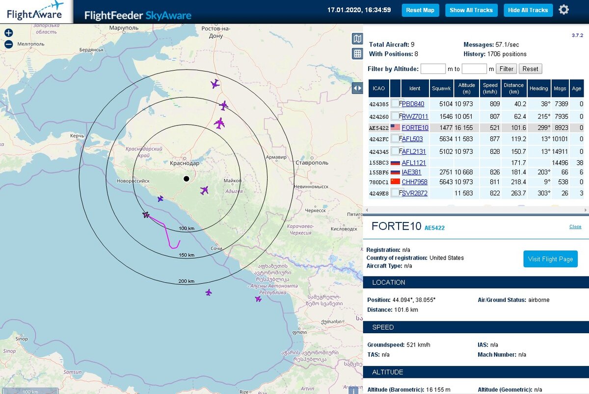 Сейчас вдоль нашего побережья сова летит Американский беспилотник Forte10 Global Hawk. Этот самолёт может до 36 часов находиться в воздухе и имеет дальность полёта до 25000 км. Высота его полёта до 19811 м. Максимальная скорость 644 км/ч Взлётный вес около 12 тонн. Стоимость единицы оценивается до 140 млн долларов , час полёта стоит 31 тыс. долларов. В 2003 году военно-исследовательская лаборатория ВВС США профинансировала разработку Атомного двигателя для Global Hawk, с целью увеличить продолжительность полёта до нескольких месяцев.