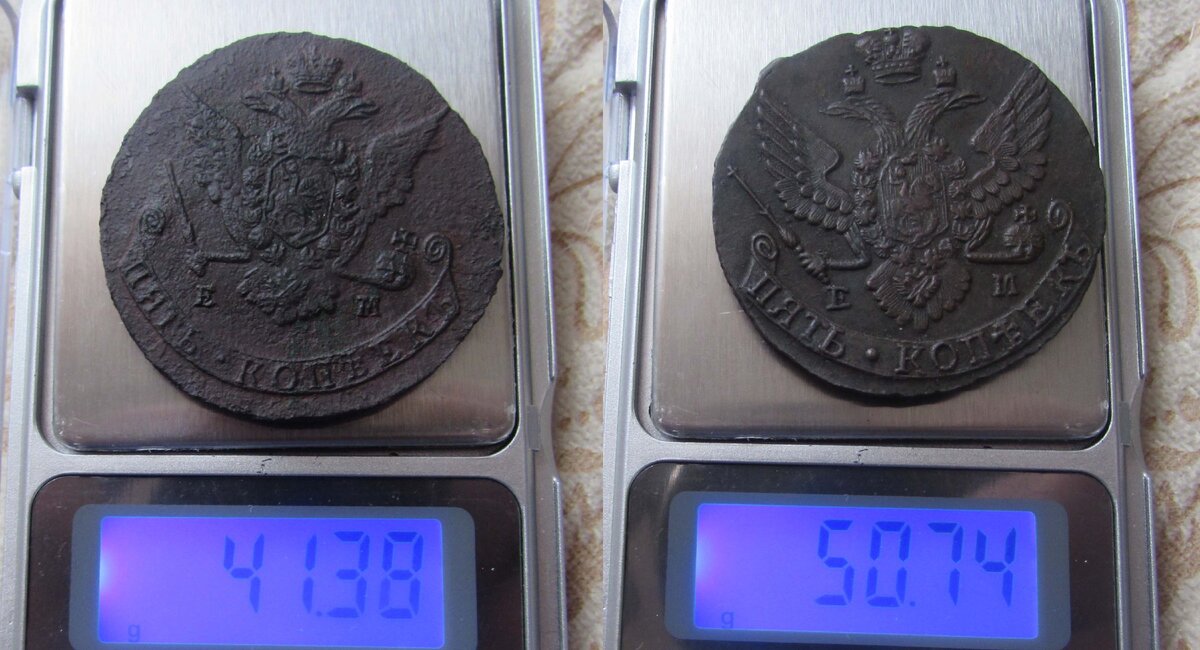 В прошлой заметке я показал покупку из Китая - электронные весы. Сейчас с ними балуюсь, как малое дитя. Решил повзвешивать красивые мощные пятаки Екатерины Второй. Для начала фотография из каталога монет, где указано, сколько должен весить медный екатерининский пятак по ГОСТу. Как вы можете видеть - вес пятака в расчете по монетной стопе должен составлять 51,19 грамм. Взвешиваем первый пятак с буквами монетного двора ЕМ (Екатеринбургский монетный двор): Вес - 41,38 грамм. Это почти на 10 грамм меньше нормы. Взвешиваем другой пятак тоже с буквами ЕМ: Этот уже тяжелее, его вес 47,35 грамм. Но до нормы не хватает 4 грамма. Другой пятак, тоже ЕМ: Вес - 50,74 грамм. Почти идеально. А теперь берем пятак Аннинского монетного двора (АМ): Вес - 53,87 грамма, почти на 3 грамма превышает норму. *** На форумах нумизматов я нашел примеры, когда екатерининские пятаки могут весить меньше 40 грамм (есть даже примеры 30-граммовых). В тоже время есть пятаки тяжеловесы, вес которых превышает 60 грамм. В
