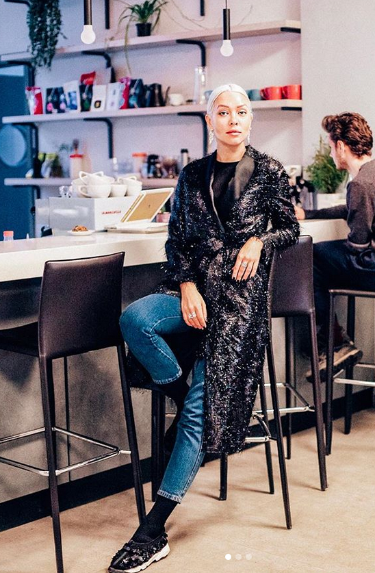 📍 как я - с голубыми джинсами, простым чёрным джемпером, кедами (но они сверкают в тон) и украшениями.