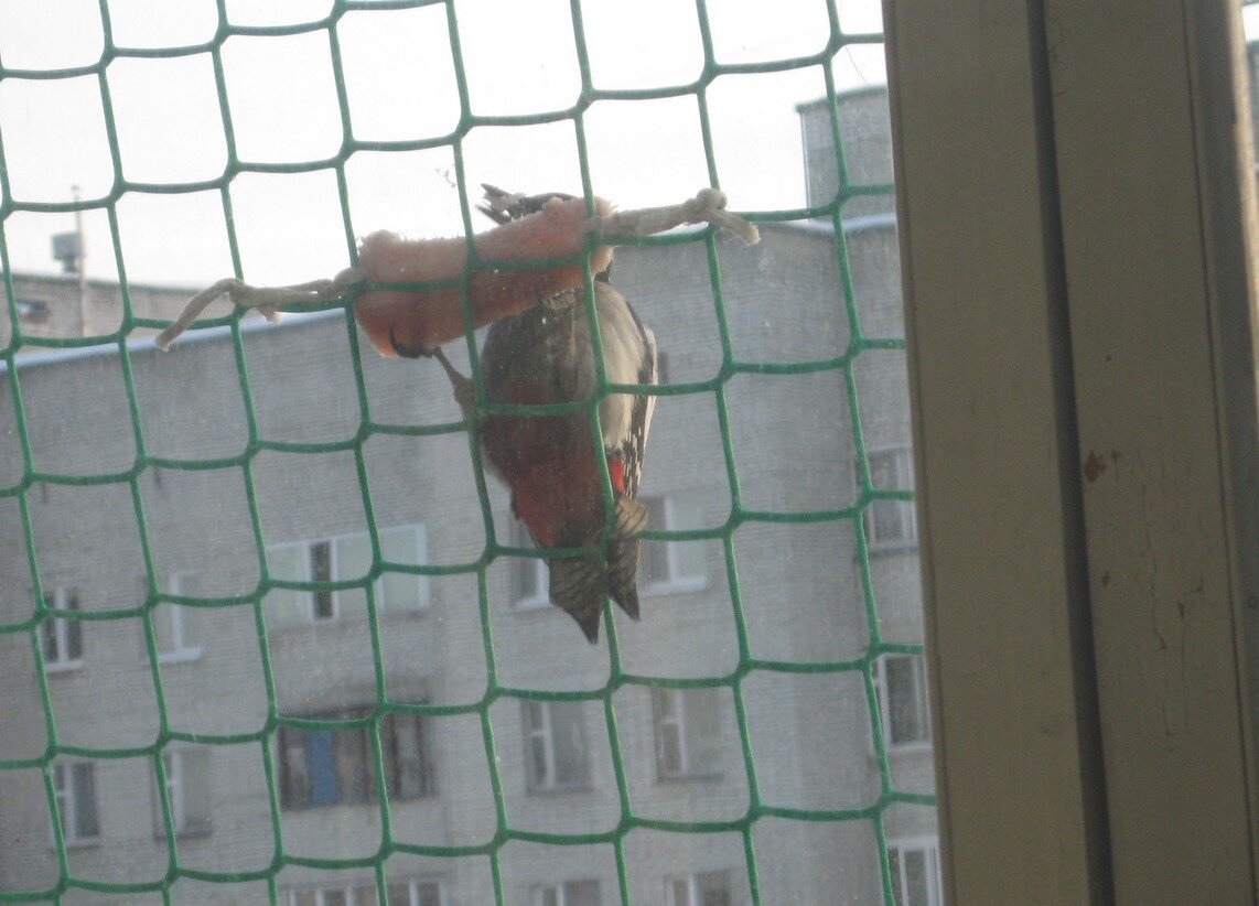 За окном на балконе у нас закреплена сетка, чтобы кошка летом не выпала. Зимой окно закрыто. Как-то повесили мы на сетку несоленое сало. И в гости прилетел дятел! Сначала услышали стук - это дятел долбил замерзшее сало. Прилетала на сало и птица пострашнее :) И, конечно, синички. На улице в морозы народ тоже вешает сало для птиц. Но в этом году зима очень теплая, сало не замерзает на улице.