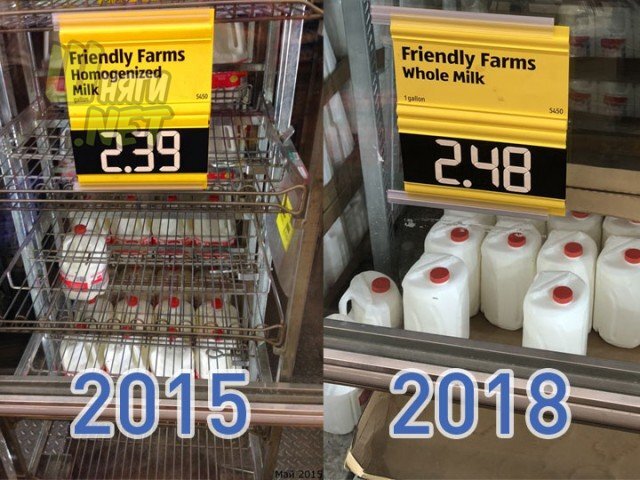 Следующие снимки были сделаны в одном и том же магазине. Фотографировались те же продукты питания. Разница состоит только в том, что фотограф приходил сюда через три года – впервые в 2015 году, а затем – в 2018. Посмотрим на изменения в цене.