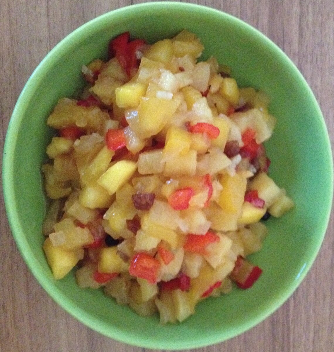 1 свежее манго 1/3 свежего ананаса 1/3 стручка красного сладкого перца ½ стручка свежего красного перца чили 15-20 г свежего корня имбиря 15-20 г изюма 50 г сахара щепотка соли 80 мл уксуса из белого вина 1 головка репчатого лука 1 маленький зубчик чеснока ½-1 лимон 1/3 ч. л. семян горчицы (по возможности) 1/3 ч. л. горошин душистого перца 1. Манго помыть, обсушить, очистить от кожуры, удалить косточку, мякоть нарезать мелкими кубиками. Ананас обмыть, обсушить, очистить, нарезать мелкими кубиками. 2. Стручки сладкого и острого перца очистить от зерен, белых перегородок, удалить плодоножки. Стручки обмыть и нарезать маленькими кусочками. Имбирь очистить от кожуры и нарезать тонкими пластинками. Крупно порубить изюм. 3. Все подготовленные ингредиенты поместить в миску, перемешать с сахаром, солью, уксусом, закрыть крышкой и оставить на несколько часов (лучше на ночь) для пропитки. 4. Лук и чеснок очистить, нарезать мелкими кубиками. Из лимона выжать сок. Настоявшуюся фруктовую смесь поме