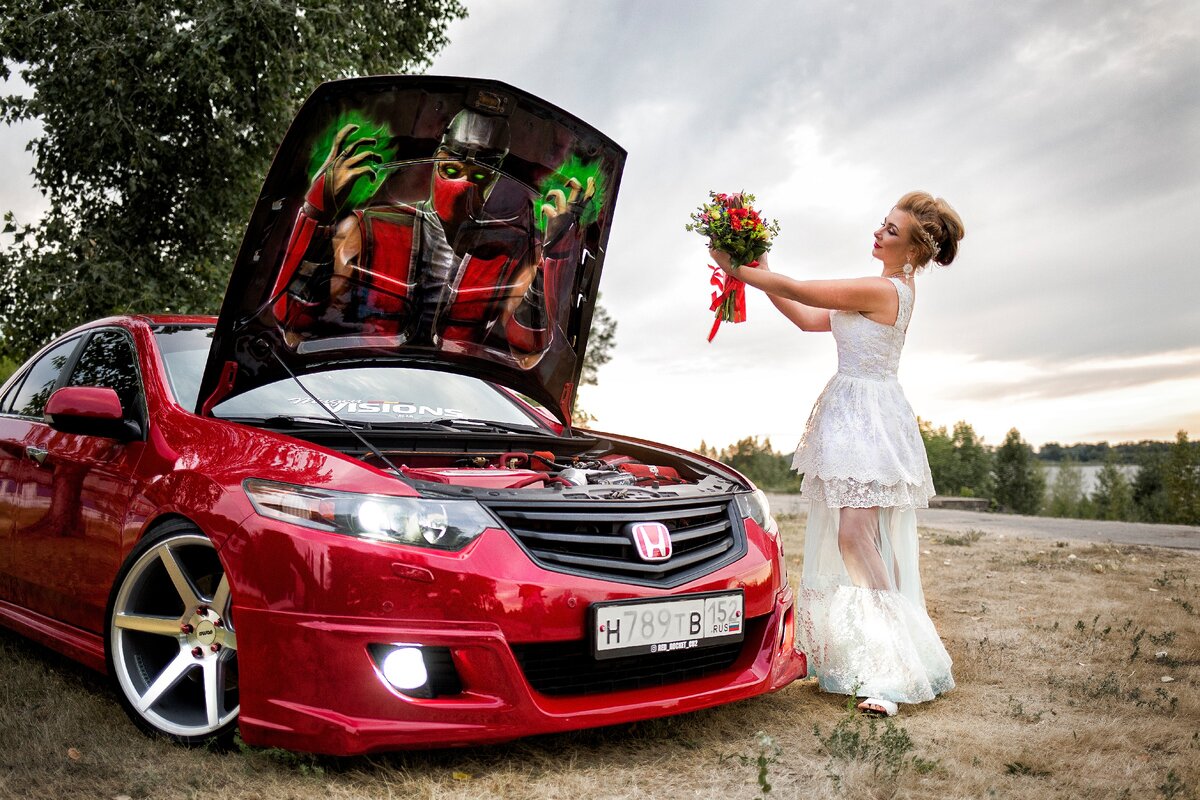 Видеоигры и супергерои — отличная тема, если хочется не розовой сказки, а кислотного комикса. Можно использовать грим, спецкостюмы, найти бэтмобиль… Впрочем, «фишкой» свадебной съемки может стать и авто популярной марки с тематической аэрографией: оно гармонично дополнит наряд невесты, а традиционный букет на столь необычном фоне заиграет новыми красками! Для фантастической свадьбы — экзотические цветы: бордовые с зеленью перышки леукадендрона и алые гребешки целозии! Целозия — родственница амаранта, гостья из жарких стран: ее название происходит от слова kelos, что по-гречески значит «пылающий». Целозия роскошно смотрится в объемных букетах с кустовой розой, лизиантусами и пышными ветками эвкалипта. Акцентами в этом букете также служат голубые гиацинты и серебристые шишечки брунии. Honda Accord 8 @red_rocket_cu2 Автомобиль со спортивной внешностью и характером.