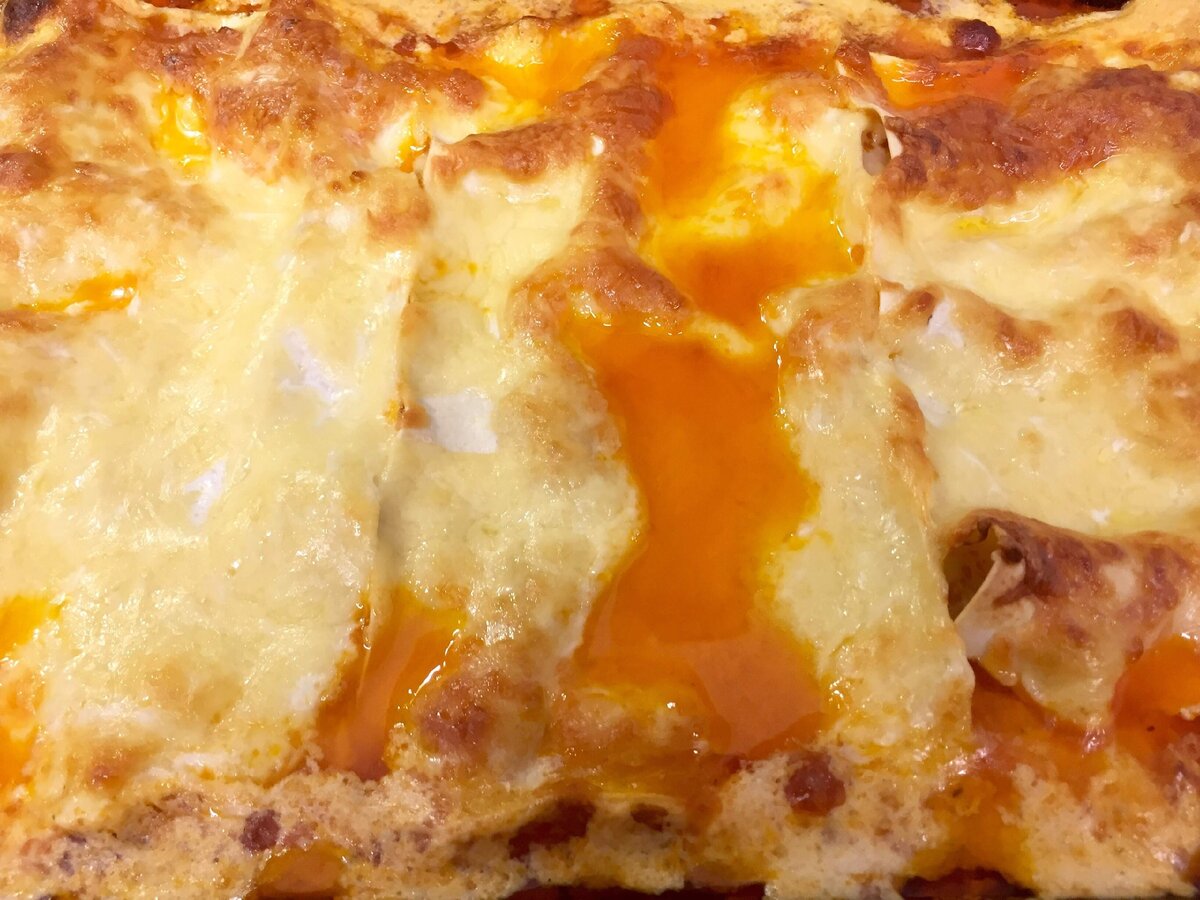 Духовку разогреть до 180 градусов. Форму смазываем сливочным маслом, выливаем немного соуса бешамель. Выкладываем листы лазаньи, на них получившийся фарш, на фарш — натертый сыр. На сыр — соус бешамель. Поверх соуса выложить сухие листы лазаньи. Повторяем до победного. Последний слой листов промазать соусом бешамель и сверху щедро засыпать сыром. Дать постоять минут 7–10.