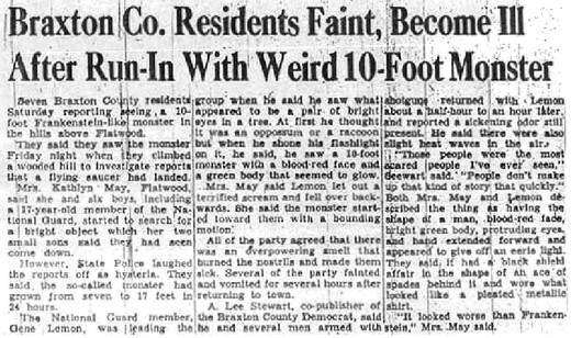 Крошечный отдаленный район в центральной части Западной Вирджинии, расположенный в горах Аллегейни, был нанесен на карту в 1952 году, через пять лет после Розуэлла, согласно сообщениям о катастрофе НЛО в Нью-Мексико. Недалеко от сельского города Флэтвудс, штат Западная Вирджиния, на маленькой ферме появился еще один космический корабль, потерпевший крушение. Однако то, что действительно отличало этот инцидент, было существо, которое управляло кораблем. Столкновения между местными жителями и этим существом вошли в современную легенду, хотя она была тщательно скрыта и счищена во время происшествия. Тем не менее, недавние расследования вытащили случай из пыльных, скрытых файлов на свет общественности.