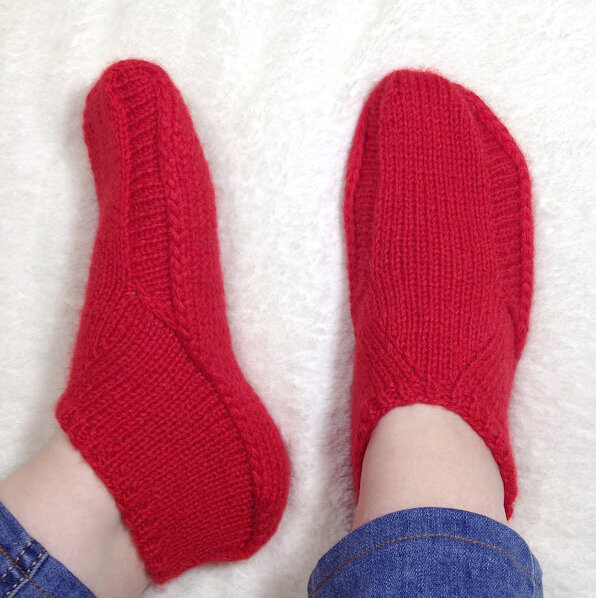 Так вяжите, повторяя ряд 1 и 2, пока петли с боковых частей не закончатся и на спице с петлями подошвы не останется 2 п. Закончите вязать, провязав изнаночный ряд.