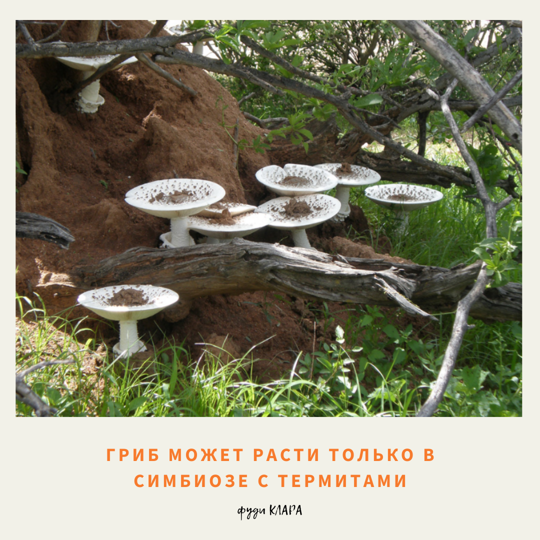 Привет, дорогой друг! Мы снова отправляемся в Африку и снова приоткроем завесу тайной жизни грибов. Всё-таки не зря они не относятся ни к растениям, ни к животным. В рубрике "необычные блюда" сегодня — огромный и даже немного пугающий "термитомицес титанический". Давай узнаем вместе, что это за "зверь". Музыка для настроения: Африканский гигант Мы с вами всё-таки привыкли, что большинство съедобных грибов довольно маленькие по размеру. Но только не этот волшебный гриб, который можно найти лишь в сезон зимних дождей и исключительно в западных регионах Африки. Например, в Замбии, где сбор грибов — неотъемлемая часть жизни местного населения. Тут этого великана почитают и любят особенной любовью. А знакомые нам белые грибы и шампиньоны скармливают домашним животным. Они попросту не нужны. Почему? Ведь есть термитомицес титанический (Termitomyces titanicus) — самый большой съедобный гриб в мире, диаметр шляпки которого может достигать целого метра, а вес — 2-х килограмм! Причём тут терм