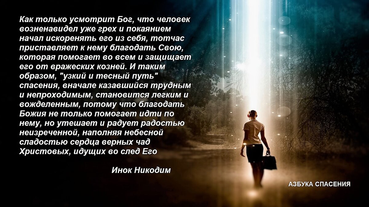 Как только усмотрит Бог, что человек возненавидел уже грех и покаянием начал искоренять его из себя, тотчас приставляет к нему благодать Свою, которая помогает во всем и защищает его от вражеских козней. И таким образом, "узкий и тесный путь" спасения, вначале казавшийся трудным и непроходимым, становится легким и вожделенным, потому что благодать Божия не только помогает идти по нему, но утешает и радует радостью неизреченной, наполняя небесной сладостью сердца верных чад Христовых, идущих вослед Его.