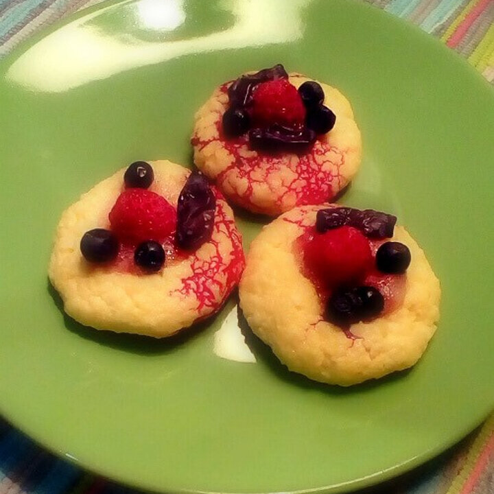 Рецепт крайне простой: кокосовой стружки 150 г, 2 яйца и творога 100 г. С мешать, сделать шарики и выпекать при 180 градусах. Вовнутрь хорошо добавить орешек миндаля. Ягоды посадила на клубнику с желатином, они растаяли и высокохудожественно растеклись. На втором фото - внутрь положены четвертинки грецкого ореха. Больше общения и рецептов - в группе "Рецепты для диабетиков" в Facebook, или в группе ВКонтакте! Рецепт на странице в Facebook