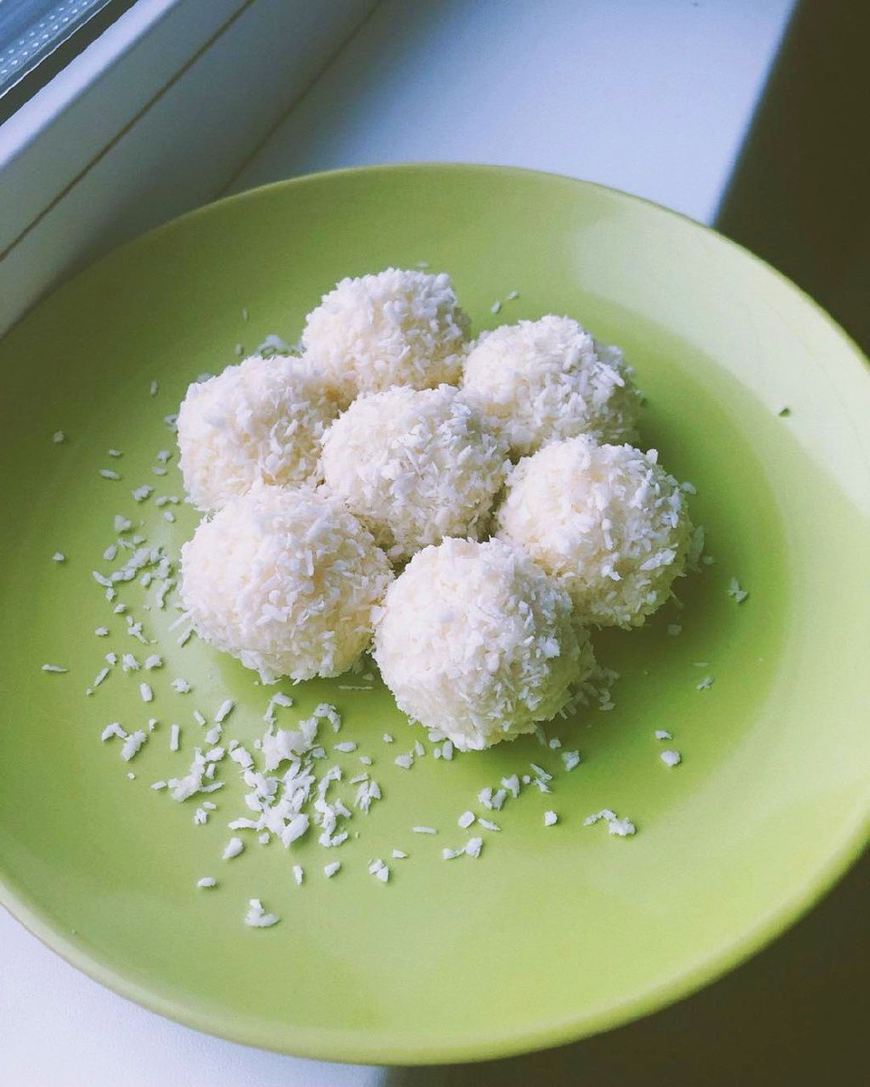 Приготовила за 10 мин🙈. ⠀ Из этого количества получается 8 больших конфет. ПОНАДОБИТСЯ: ✔️Кокосовая стружка - 80гр ✔️Сухое молоко - 1-1,5 ст.л. ✔️Мёд - 1 ст.л. ✔️Тёплая вода - 1,5 ст.л ✔️Миндаль для начинки ПРИГОТОВЛЕНИЕ: ✔️Пару ложек стружки отсыпать в тарелку(для обваливания конфет) ✔️Остальную стружку смешиваем с сухим молоком, мёдом и водой. ✔️Все хорошо перемешать, и на начальном этапе показалось что склеить шарики не получиться, но по факту все оказалось нормально👌. Нужно просто все хорошо перемешать. ✔️Лепим шарики, добавляя в серединку орешек и в конце обвааливаем в стружке. ✔️Убираем в холодильник. Приятного аппетита,мои кулинарики 🙈