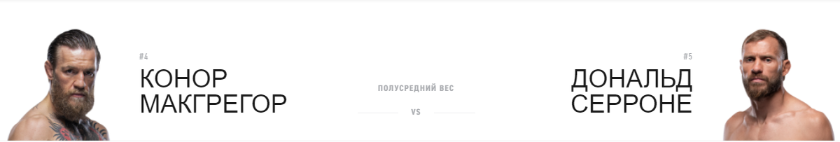 Список участников основного карда на UFC 246 Напоминаю, что очередной номерной турнир Ultimate Fighting Championship 246 состоится 19 января в Лас-Вегасе. В общей сложности на турнире планируется провести 13 боев. Прелимы начинаются в 2:15 по МСК, а главный кард в 6:00 по МСК. Примерное время боя Макгрегор - Серроне - 8:00.