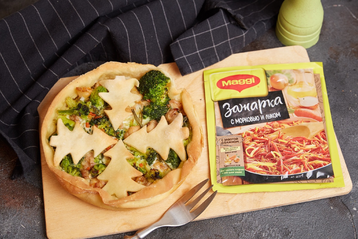 Ингредиенты MAGGI® Зажарка – 2 ст ложки Слоеное тесто –200 гр Курица – 1 окорочок Брокколи – 150 гр Яйцо – 1 шт. Тимьян – по вкусу Розмарин – по вкусу Масло растительное – 1 ст ложка Как приготовить Тесто выложить на рабочую поверхность. Отделить листочки розмарина и тимьяна от стеблей. Курицу освободить от кожи и костей, мясо нарезать кубиками. Брокколи разделить на небольшие соцветия. Обжарить курицу в сковородке, добавить брокколи, пряные травы и MAGGI® Зажарка. Постоянно перемешивая, готовить еще 5 минут. Охладить начинку до комнатной температуры. Раскатать тесто в тонкий пласт. Смазать форму растительным маслом и выложить тесто, формируя высокие бортики. Выложить в заготовку пирога охлажденную начинку. Взбить яйцо и залить в пирог. Поместить пирог в духовку, разогретую до 180 градусов, на 30 минут. Подавать горячим, нарезав пирог на порции. Приятного аппетита! : ) Заранее благодарим за поставленные лайки! Комментируйте, готовьте с удовольствием и делитесь своими результатами.