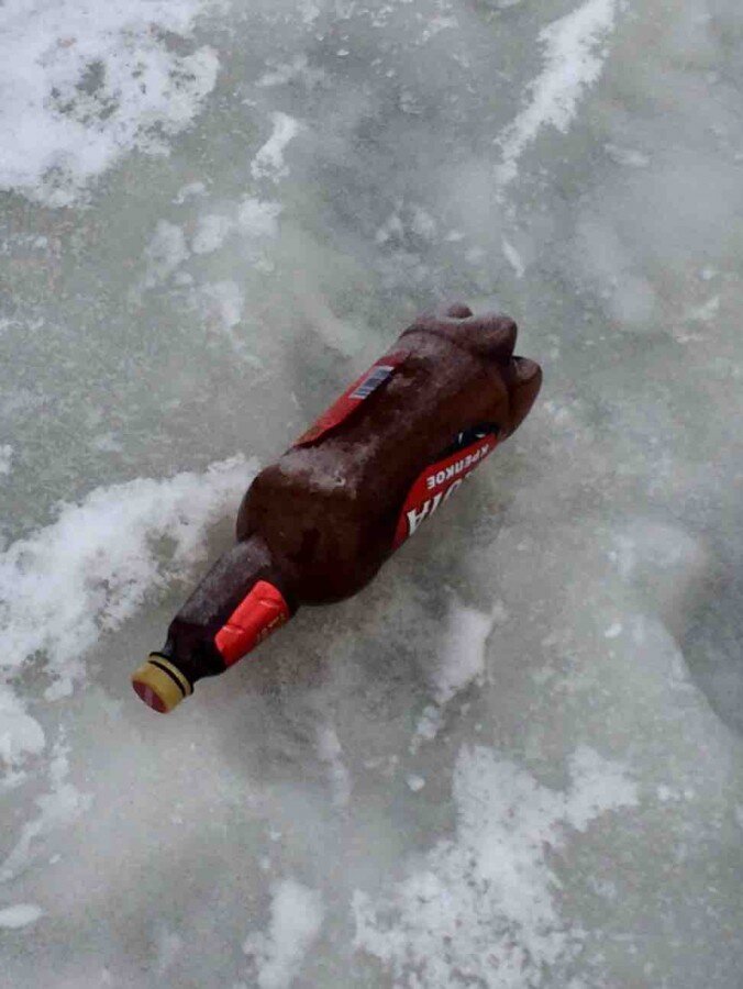 После того как я проспал Новый год, первого января мы вернулись в город. Шурин Дима предложил съездить завтра на ГЭС, хоть я и не люблю это место из за его прессинга, но не отказался. А почему бы не съездить. Посмотреть что да как там. Заодно протестировать закаченные карты в навигаторе. И поставил себе задачу ловить принципиально только на безмотылку «кошачий глаз». Проснувшись утром, собрав весь шмурдяк, мы отправились в путь. По дороге прикидывали примерный план поиска рыбы. Но весь наш план улетел в трубу, когда мы только вступили на лёд. Такой «красоты» на бескрайних просторах льда я ещё не видел. Это пустые бутылки из под алкоголя в замёрзших лунках. Это шелест пакетов на льду. Это баклашки из под пиво, тонко гармонируют с ведерками из под майонеза. Такой некий зимний абстракционизм. Прогулявшись пол часа по этой выставке постмодернизма, наши глаза больше не смогли лицезреть эту красоту. Мы с Димой решили слинять в «Ландыш». По пути заехали в сельмаг, купили печенье к чаю. С