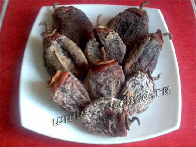 - Плоды помыть, высушить и, очень аккуратно тонким слоем, снять с них кожицу, но не всю. Вокруг черенка нужно оставить тонкий слой кожицы для того, чтобы - когда хурма будет сушиться - она не упала от собственной тяжести.