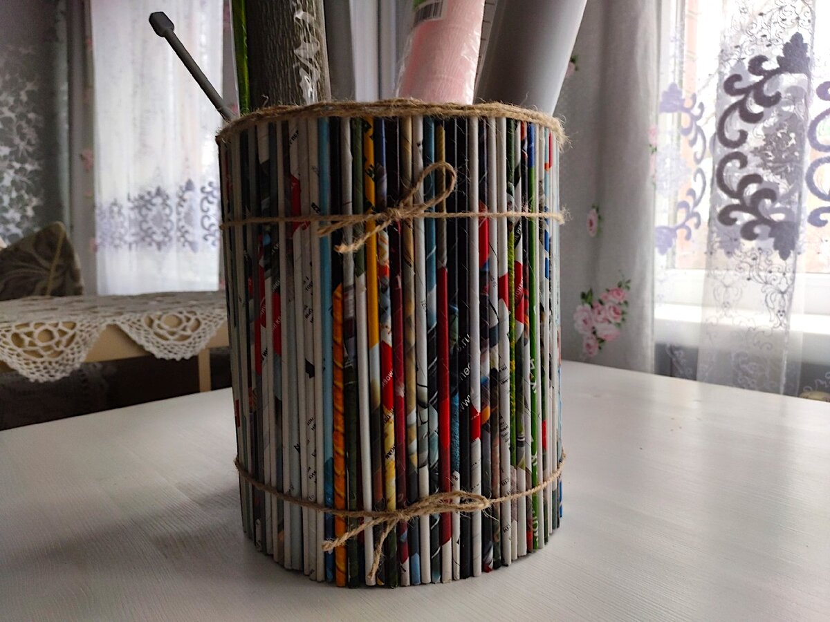 У меня это трубочки из страничек журнала. Когда стала искать журнал, к своему удивлению, не нашла. Уже несколько лет не покупаю глянцевую типографию.