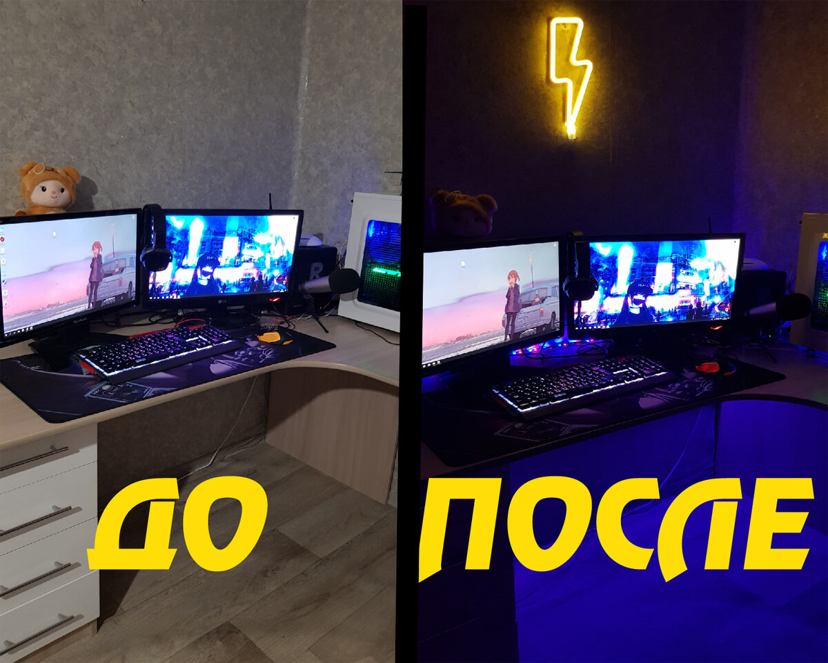 А на оставшуюся половину я купил светодиодный неоновый знак usb , который так же обошелся мне за 500 рублей. Он работает как от батареек ( 3 пальчиковые батарейки ) Так и от простого Usb. Все это пришло мне меньше чем за месяц в ценности и сохранности. Светодиодную ленту я пустил сверху в доль стола и то что осталось пустил вниз и подключил это все дело к пк. Молнию же я повесил на стену , на пару булавок держится она хорошо.