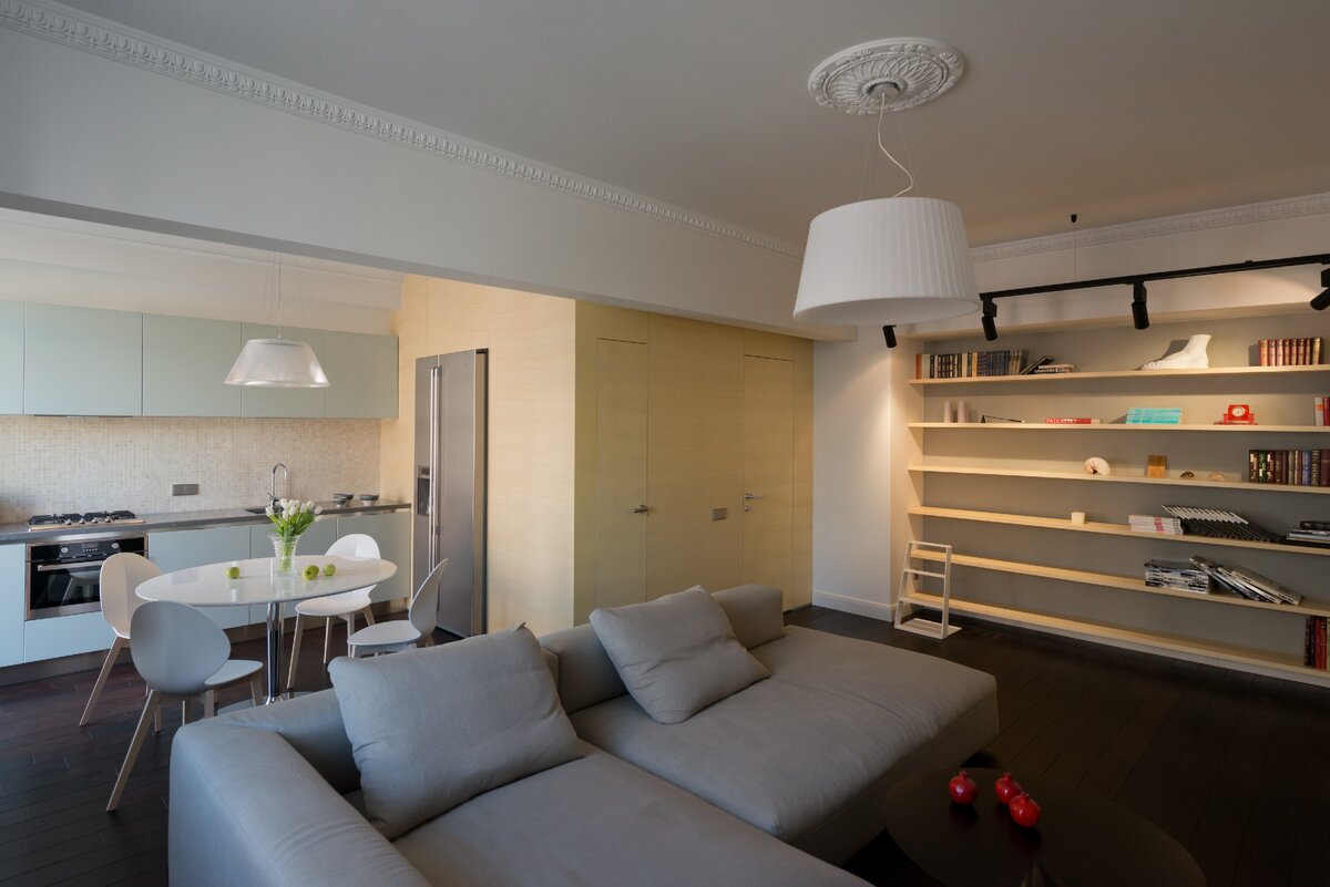 Бесспорное достоинство проекта — выбор цветовой палитры, в которой белый комбинируется с пастельными тонами. Природные оттенки — серо-бежевые, кремовые, бледно-голубые — идеально подходят для московского климата, при этом их легко можно заметить во всех без исключения помещениях квартиры.