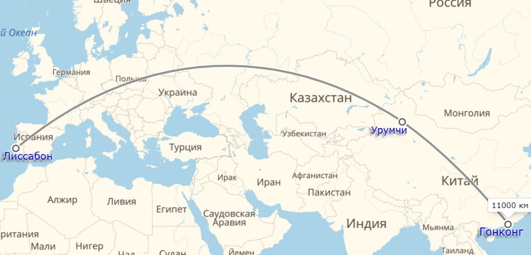 Продолжаю тему, начатую в этой статье: https://zen.yandex.ru/media/simlewords/goroda-na-priamyh-chast-1-5deaa580c7e50c00b8dbd766 Тогда я написал, что таких очевидных совпадений больше не удалось найти, однако было несколько кандидатов. Именно о них и поговорим во 2 части. Первый такой кандидат – маршрут «Лиссабон – Гонконг». Как и в рассмотренном в первой статье случае этот маршрут соединяет два известных портовых города с очень хорошими бухтами, созданными природой. Если соединить их кратчайшей линией, то она проходит в непосредственной близости или даже через центр следующих городов: Лион (Франция), Лозанна, Берн, Цюрих (Швейцария), Мюнхен (Германия), Катовице, Люблин (Польша), Гомель (Беларусь), Орёл, Пенза, Сызрань, Самара (Россия), Караганда (Казахстан), Урумчи (Китай). Городов конечно много, но они не так идеально попадают на прямую, как это было с линией через Мюнхен, Москву и Екатеринбург. Да и не все из них крупные, старинные или известные. Однако несколько моментов скло