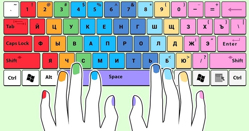 Цвет ногтей каждого пальца соответствует цвету клавиш на клавиатуре.