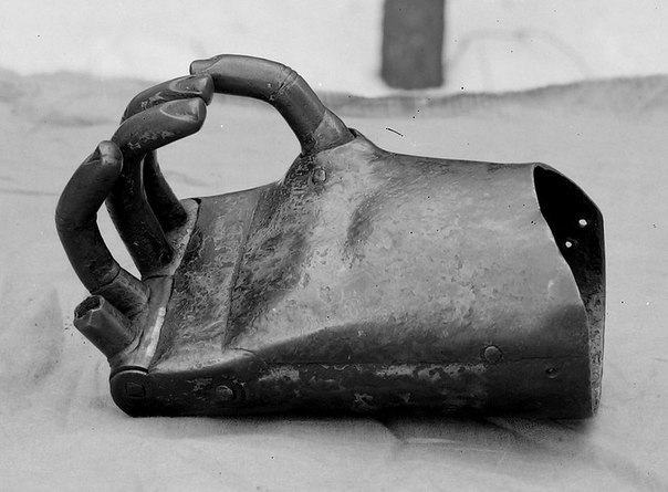 Как бы там ни было, руки больше не было, и бедному рыцарю вроде бы полагалось отправиться на покой. Либо найти новый способ продолжать сражаться за звонкую монету. В принципе, к этому моменту уже можно догадаться, какой путь выбрал наемник. Вскоре после неудачной встречи с артиллерией, Берлихинген щеголял клацающей и щелкающей металлической конечностью.Первая модель не отличалась сложностью. Пластина с двумя петлями, благодаря которым четыре крюкообразных пальца загибались внутрь и держали меч. Других действий такая рука не предполагала. Протез даже детализировали, выделив пальцы, ногти, костяшки и морщины.