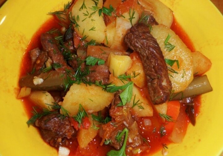 АЗУ ПО-ТАТАРСКИ И так соcтав: Мяса 150-150 г, масла топленого – 15 г, томат-пюре – 15 г, огурцов соленых 50 г, картофеля – 150 г, лука – 35 г, соль, перец, чеснок. Это по книге – «Татарская кухня». – Казань: Татарское кн. Изд-во, 1985 г. В принципе, можно поискать в интернете, различия, если и будут, то незначительные. Вот только одно, меня всегда умиляет рецептура таких вот блюд в граммах! Типа я должен лука отрезать 35! Не больше и не меньше! Вовсе нет, я беру луковицу, две, три, в зависимости от количества мяса, и как вообще привык. Мое мнение, что лука в азу должно быть достаточно много. А если кому лук не нравится, можно и уменьшить его количество. В общем обычно беру картофеля столько же, сколько и мяса (говядина), на 3 картофелины одну луковицу, одну-две помидорки (вместо томатной пасты), один-два соленых огурца, и морковку. Да-да, именно! В рецепте ее нет, но моя теща, которая родилась и выросла в Казани, делала всегда азу с морковью. И жена против, когда я убираю мор