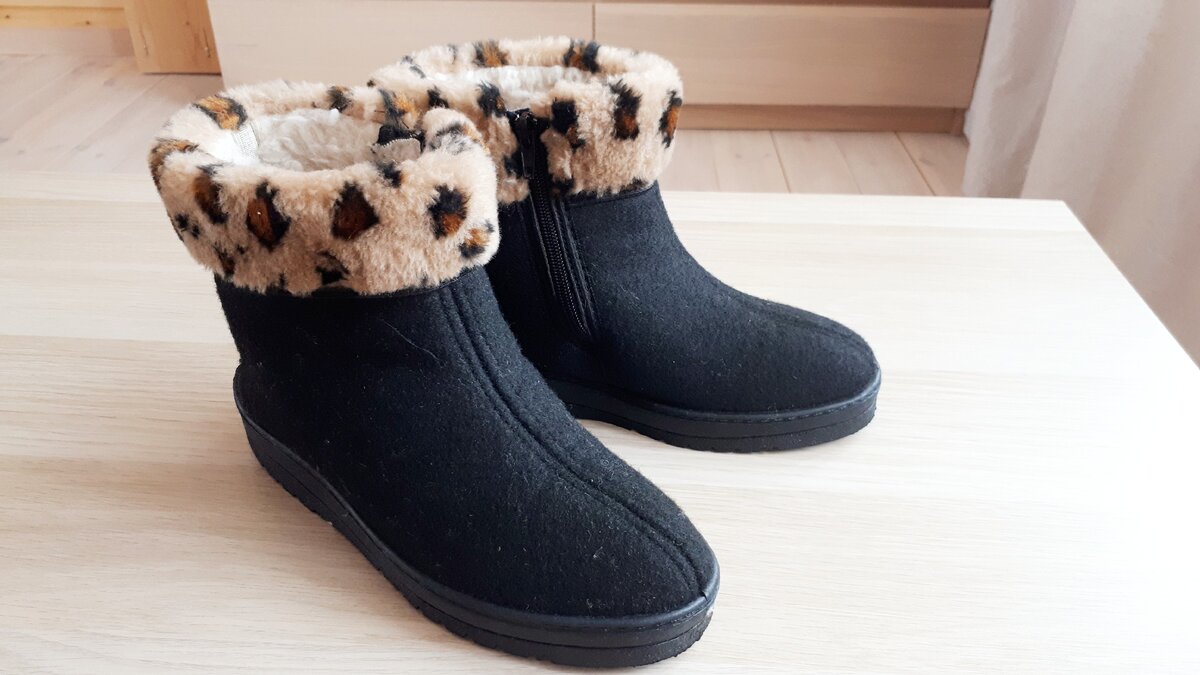 Кстати, у них толстая подошва из мягкой резины, совсем не скользит. Думаю, даже в сильный мороз ноги не замерзнут. Верхняя часть из войлока, внутри мех, так что ногам тепло и удобно.