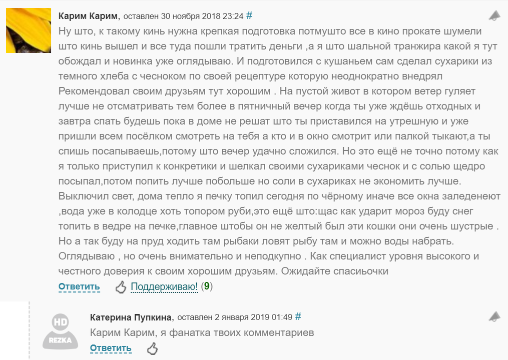 Его специфический стиль обсуждения фильмов и сериалов на HDrezka вызывает временный ступор, после которого пытаешься уловить суть в контексте комментария, но в итоге чувствуешь расслабление и позитив. Наверно поэтому он собирает десятки лайков под своими сообщениями и целые ветки с обсуждениями, на которые он охотно отвечает. Порой кажется, что он не с этой планеты или просто болен психическим заболеванием. Попробуйте сами разобрать, какую информацию он пытается донести до публики. Может вы разберёте какое нибудь внеземное послание. Может кто знает, кто такой этот Карим Карим? Я его отзывы встречаю практически под каждым фильмом, и, кстати, у него хороший вкус. Пока искал его комментарии на сайте, заметил, что он не «оглядывает» плохое кино.