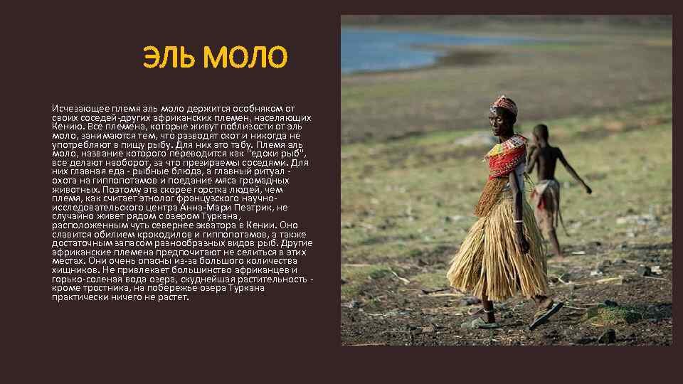 Малочисленное племя Эль Моло проживает на территории африканского озера Туркан и считается одним из самых опасных в округе. Несмотря на многочисленные попытки властей упростить жизнь общины, туземцы отказываются пользоваться благами цивилизации. Единственным исключением они сделали прием в дар несколько моторных лодок, которые упрощают процесс рыбной ловли. Основной рацион представителей народа состоит именно из рыбы, приготовленной сомнительным образом на кострах. В результате скудного питания и отсутствия полезных веществ, смертность у Эль Моло давно превысила рождаемость. Средний возраст не превышает 50 лет, дети отличаются слабым здоровьем и болезненным видом. В отличие от других племен, дикий народ не принимает товарно-денежные отношения, отрицая все проявления прогресса. Они живут в ужасных климатических условиях, в качестве подручных средств используют кости рыб и растительные остатки. Особенным проявлением роскоши у дикарей принято считать мясо гиппопотама и крокодила.