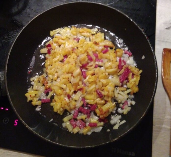 есть множество вариантов приготовления жаренной картошки. здесь я расскажу как приготовить самую вкусную жареную картошку (на мой взгляд) ну или хотя бы точно не останется без внимания у мужчин. если девушке нужно завоевать сердце мужчины, а как мы знаем путь к нему лежит через желудок. то то точно поможет)) что нам потребуется? сковородка, чем больше тем лучше. картофель ~ 1кг или 3-5 шт. лук репчатый - 1 головка. чеснок - 1-2 дольки.(по вкусу) колбаса салями, 3 -4 ломтика. подсолнечное масло 50г. или одна рюмка. с начала нарезаем лук, на маленькие ломтики, потом ставим сковородку, на маленький огонь, у меня на плите это 5 из 9ти. и льём подсолнечное масло,кидаем лук. за то время пока разогреется сковородка, можно почистить и порезать картошку, картошку нужно резать мелко, толщиной 3 -4 мм, это примерно как в макдаке, только не такие длинные)))к этому времени лук уже успеет пустить сок. и на разогретую сковородку закидываем картошку, сразу поле можно добавить чеснока, это
