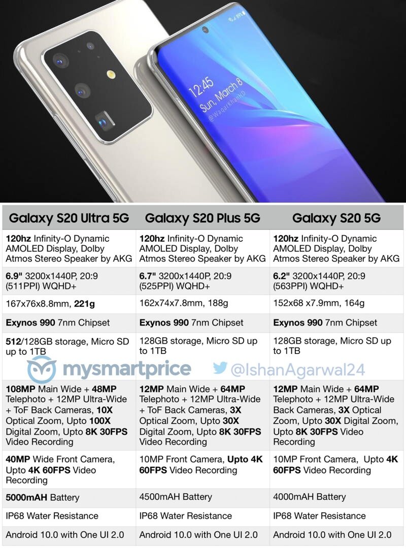 Galaxy S20 5G, Galaxy S20 Plus 5G и Galaxy S20 Ultra будут отличаться габаритами, диагональю экранов, камерами, объёмом памяти и ёмкостью аккумулятора. Смартфоны объединяет дизайн, защита от воды IP68, процессор Exynos 990, звук от AKG с поддержкой Dolby Atmos, 120-герцовые AMOLED-матрицы Infinity-O, возможность использования в сетях 5G и Android 10 с оболочкой One UI 2.0. Galaxy S20 Ultra — самый топовый смартфон. Он обладает экраном диагональю 6,9 дюйма, 108-мегапиксельной основной камерой с 10-кратным оптическим зумом и записью видео 8K, 40-мегапиксельной фронтальной камерой с поддержкой 4K-видео и аккумулятором на 5000 мАч. Galaxy S20 Plus 5G более простой девайс с экраном 6,7 дюйма, а Galaxy S20 5G вообще кажется середнячком на их уровне.