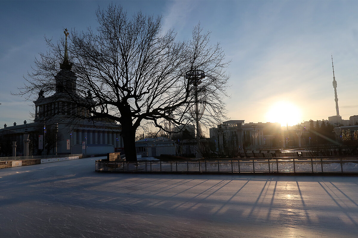 В этот уикэнд отправились мы погулять на ВДНХ. Термометр показывал +6 и было интересно - а работает ли каток?.... Вот в Сокольниках "всепогодная лыжня" закрыта по причине плохой (бесснежной) погоды. А каток?.... Солнце светит, птицы поют - если не смотреть на календарь - то это прохладный апрель, или теплый март. Но на дворе стояло Крещение! Да, так а что же у нас с катком?.... И ближе к вечеру он засиял разноцветными огнями - и принял гостей! Конечно, если бы лежал снег, то все световые украшения отражались бы в льдинках, всё сверкало бы, было бы волшебно.... Увы, снега нет. Но ВДНХ всё равно выглядит сказочно красиво. А если хотите увидеть, как выглядит девственно-гладкий каток, без единой царапины коньков - посмотрите мой фото-рассказ вот здесь! Красивые фото получаются с мостика над катком. Вот например, павильоны Казахстан и Азербайджан: Кстати, павильон Азербайджан открыт для посещений, и внутри много интересного и красивогго! Об этом можно почитать-посмотреть у меня вот здесь