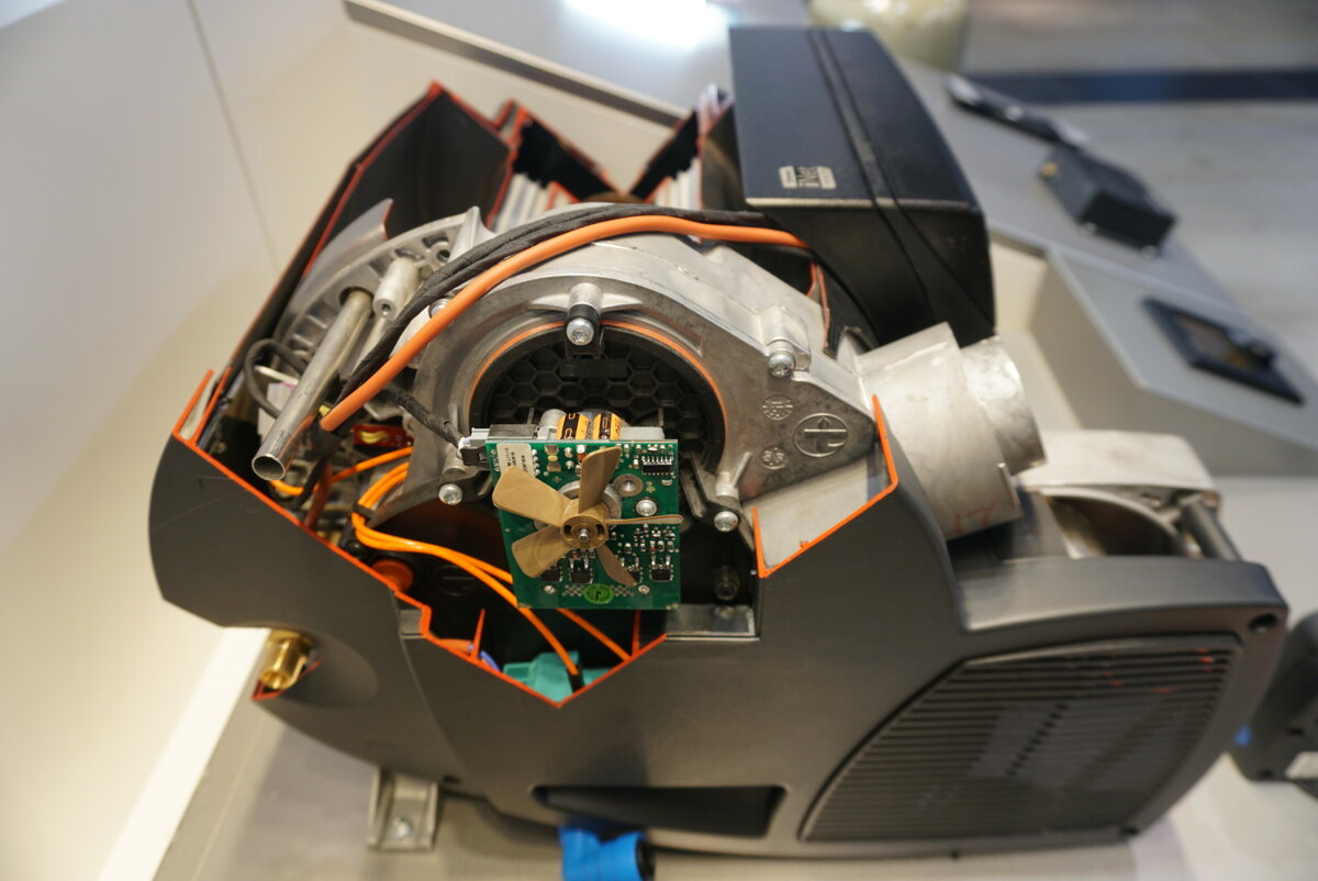 Печка, на самом деле, очень серьезная и сложная по своей конструкции. Однако всё это десятилетиями дорабатывалось и доводилось до состояния, чтобы обычный человек мог понять как ей пользоваться за пару минут. Газ поступает из баллона в печь через понижающий редуктор на 30 мBar. В самом центре находится камера сгорания. Там газ смешивается. воздухом, воспламеняется, горит с определенной интенсивностью. Выхлопные газы выводятся наружу через отверстие сбоку автодома. Камеру сгорания окружает оболочка из радиатора. Она передаёт тепло воздуху который прокачивается под давлением и далее распределяется по трубопроводам. далее над воздушной оболочкой есть ещё и водяная. Таким образом, печь одновременно прогревает и воду и воздух. Если печь не работает и температура внутри падает ниже +2, то открывается клапан и вся вода из бойлера сливается чтобы его не порвало. В пространстве где греется воздух могут быть встроены электрические тени на 220V. Тогда печь может греть автодом от внешнего питан