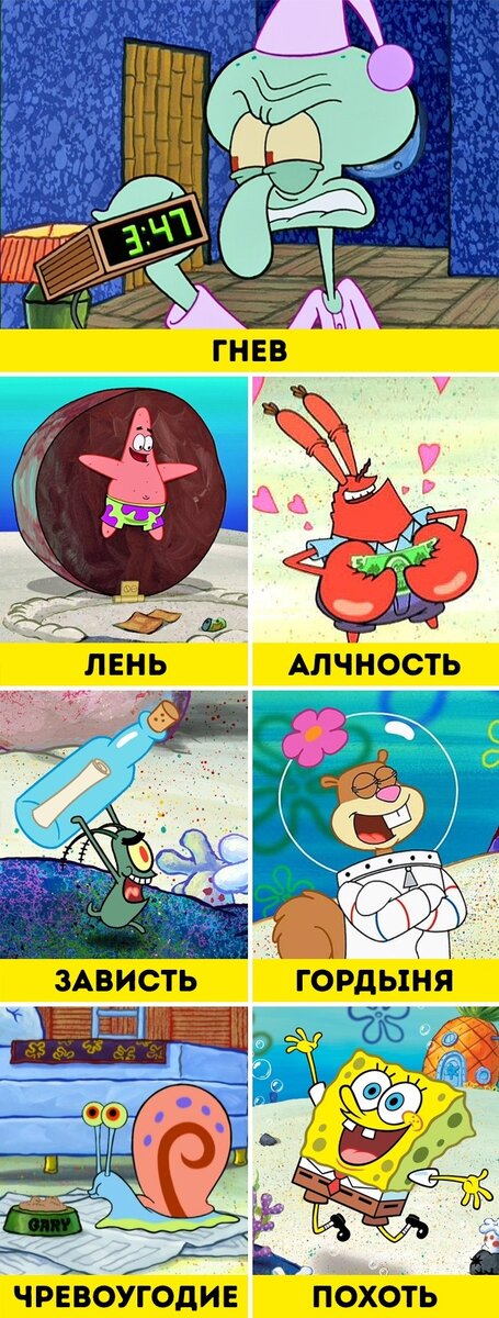 "Губка Боб Квадратные Штаны" Веселый мультфильм про губку-простачка и его друзей, согласно одной из теорий, не так уж и беспечен: предполагается, что это аллюзия на 7 смертных грехов. Так, Сквидвард олицетворяет гнев, Патрик — лень, мистер Крабс — алчность, Планктон — зависть, Сэнди — гордыню, Гэри — чревоугодие, а Губка Боб — похоть. Последнее выглядит странным, но если учесть, что одно из значений слова «похоть» — любвеобильность, то все встает на свои места: Губка Боб любит всех вокруг. "Эй, Арнольд!" В мультсериале Арнольд живет с бабушкой и дедушкой и не помнит своих родителей. Но, возможно, он всю жизнь жил с ними, сам того не зная! Как предполагает одна из фанатских теорий, бабушка и дедушка Арнольда — его настоящие родители. Они завели ребенка в очень позднем возрасте, и в результате он родился с отклонением — головой необычной формы. Фил и Герти боятся, что из-за стариков-родителей над репоголовым мальчиком будут смеяться еще больше, и притворяются его бабушкой и дедушк