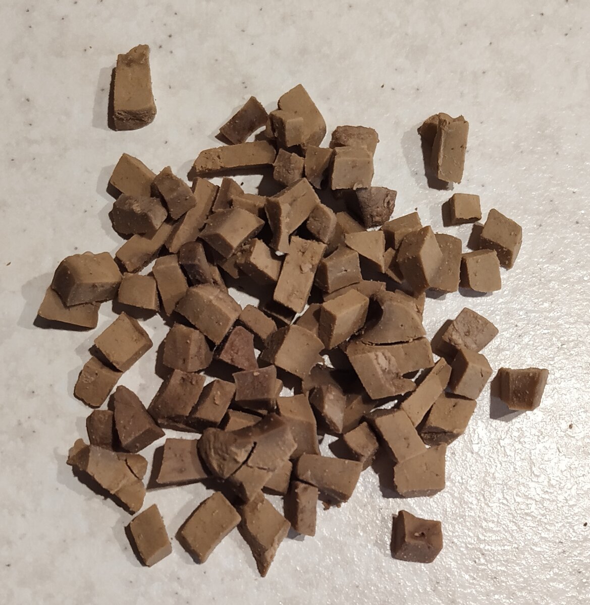 В этой статье я хотела бы поделиться с вами рецептами лакомств, которые готовлю для своей собаки сама. Печень говяжья для тренировки Первое и самое простое лакомство, если у вашей собаки нет аллергии на говяжью печень – это, собственно, она. Раньше, я изощрялась и готовила печень по особому рецепту: нарезала ломтиками, толщиной 1 см, обжаривала с каждой стороны буквально по несколько секунд на раскалённой сковороде, потом заливала водой, добавляла тёртую морковь и тушила минут 30. После чего счищала с ломтиков морковь и запекшуюся кровь и нарезала их на маленькие кусочки, которые очень удобно использовать при дрессировке и подсушивала в духовке. Но однажды время, которое я могла потратить на приготовление сего деликатеса было очень ограничено. В связи с чем было принято решение просто отварить печень всё теми же ломтиками толщиной в 1 см и после чего сразу нарезать на маленькие кусочки. Чип оценил данную оптимизацию процесса и теперь я просто бросаю печень в кипящую воду и варю в течен