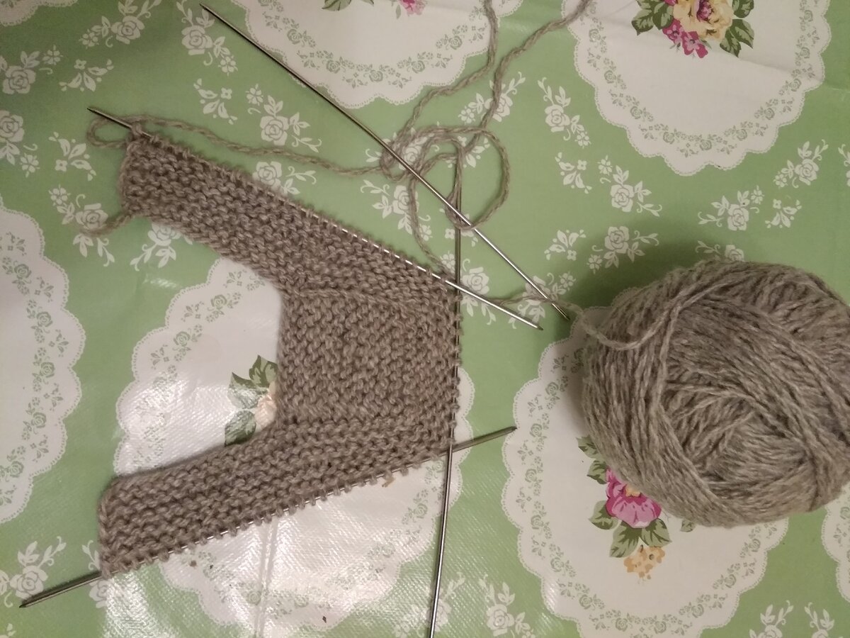Набираем 45 петель на спицу. 1-ряд: 1 кромочная петля, 27 лицевых, наше изделие поворачиваем. 2-ряд: кромочная петля, 10 лиц, так же изделие поворачиваем. 3 - ряд: кромочная петля, 10 лиц, изделие поворачиваем. Вяжем так по 20 ряд включительно. 21 - ряд: кромочная петля, 10 лиц, поддеваем 10 петель с боку, 16 лиц, кромочная . 22 - ряд: кромочная петля, провязываем 36 лицевых петель и с боку поддеваем 10 петель, затем 16 лиц, кромочная. 23 - ряд: кромочная петля, все лицевые петли, кромочная. Так вяжем до 36 ряда. 37 - ряд: кромочная, 36 лицевых петель, 2 петли вместе изнаночные, изделие поворачиваем. 38 - ряд: кромочная петля, 9 лицевых, 2 петли провязываем вместе лиц, изделие поворачиваем. 39- ряд: кромочная петля, 9 лиц, 2 петли провязываем вместе изн, изделие поворачиваем. 40 - ряд: кромочная петля, 9 лиц, 2 петли вместе лиц, изделие поворачиваем. Вяжем 39-40 ряды до тех пор, пока на двух спицах не останется по 4 петли. 83 - ряд: кромочная петля, 2 петли вместе лиц, 5 лиц, 2 в