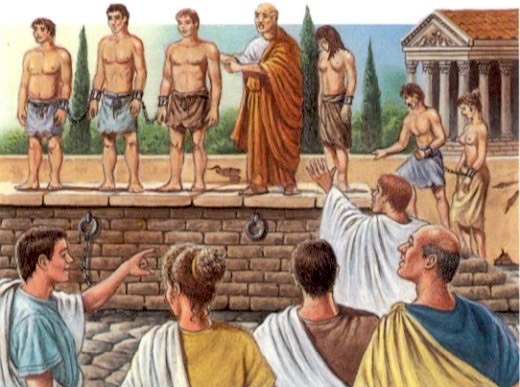 Однажды на невольничьем рынке в Помпеях богатый приезжий сенатор из Рима решил купить себе двух рабов. Стояла духота, на узеньких улочках города толпился народ. В ожидании стояла длинная вереница из повозок, запах гнилой говядины чувствовался повсюду. Сегодня забивали 1000 быков в честь Богини Исиды. По улицам то тут, то там были слышны крики пьяниц. Сенатору это совсем не понравилось. Брезгливо, в тонких сандалетах он прошелся по грязной улице и вошел на рынок рабов. Воняло мочой и калом. Смотритель, увидев сенатора, живо вскочил со скамьи и выстроил рабов в шеренгу. Рабы, звеня цепями, встали с земли и построились. Богатый Римлянин прошелся и указал на одного маленького раба, который стоял в конце шеренги. - Сколько стоит твоя жизнь, раб? – спросил он у грязного, но мускулистого раба. -Только вы определяете цену, господин. -Сейчас тебе выдадут меч и ты сразишься со мной! – сказал сенатор. Что поделать, слово господина - закон. Завязался бой. Несчастный раб еле успевал увернуться о