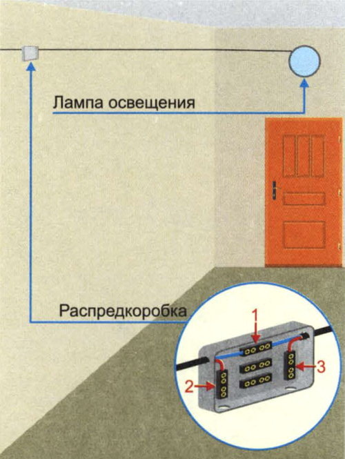 Проходной выключатель позволяет управлять освещением с двух разных точек. Например, если установить ее во дворе, то можно включать свет, войдя в калитку, и выключать его у двери дома. Либо наоборот, включить свет у двери, затем дойти до калитки и выключить. Другой вариант, как это сделать в коридоре квартиры. Обратите внимание, что комплект проходных выключателей поставляется в наборе и соответственно расшивка электрической схемы может отличаться у разных производителей. Поэтому, лучше покупать проходные выключатели в комплекте и соблюдать порядок установки, указанный в инструкции, электрическую схему подключения каждого из устройств в наборе. Инструменты и материалы для работы: отвертка, бокорезы или плоскогубцы, нож. Монтируем коробку из комплекта проходного выключателя. Прокладываем провод от источника питания к коробке, соединив нуль с общей клеммой (1), а фазу с клеммой первого выключателя (2). Далее от коробки тянем кабель к лампе, подключив один провод к общей клемме (1), а д