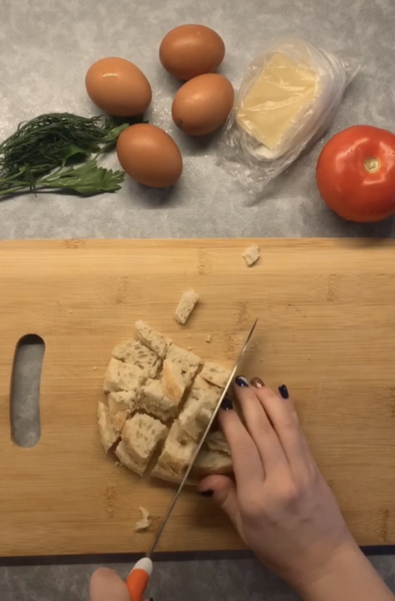 Легкое и свежее блюдо для вашего завтрака!Омлет-это один из самых популярных завтраков во многих семьях. Её любят и взрослые и дети. Приготовить её очень просто, а добавляя каждый раз какой-либо новый ингредиент, можно получать каждый раз новый вкус. В моей семье любят омлет с помидорками ,сыром и хлебом. Ингредиенты: 1) Нарезаем хлеб небольшими кубиками и выкладываем на сковородку с подсолнечным маслом 2) Нарезаем помидор кубиками и отправляем на сковородку к хлебу 3) Яица вливаем в миску 4) Добавляем зелень и майонез. Хорошенько все перемешиваем 5) Выливаем полученную смесь на сковородку и закрываем крышкой 6) Натираем сыр на крупной терке и добавляем к нашему омлету и под крышку ещё на 5 минут, на медленном огне Наш вкуснейший омлет готов💁🏼♀️ Приятного всем аппетита😋