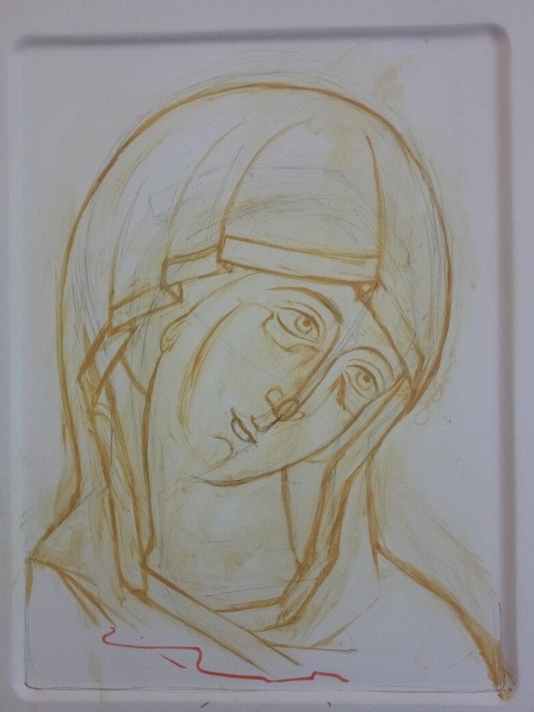 Построение рисунка сравнимо с крещением, когда человек облачен в крещальную сорочку, так и доска одета в белый девственный левкас. Как во время крещения и возрастания в Боге Дух Святой начинает писать свой образ, так и на левкасе проявляются первые начинания. Когда рисунок отработан, начинается подготовка под золочение. Золото, это символ Божественных энергий, Нетварного Света, благодати Господа Нашего. Для нас сейчас небо голубое-синее, и мы даже и представить не можем, что оно было золотым, наполненным Божественным Светом. Раскрытие цвета. Как Адам был когда-то сотворен из глины, так и в иконописи большинство пигментов составляют глины. Прописываем описи, и начинаем первые слои личного. Почему такие красные? Спросите вы. Если перед охрением не делать красную подложку из киновари, то лик будет смотреться серым, мёртвым. Охрим. Постепенно , слой за слоем делаем личное светлым, приятного медового оттенка. Ну вот, личное дописано, последние движки и акценты расставлены, ос