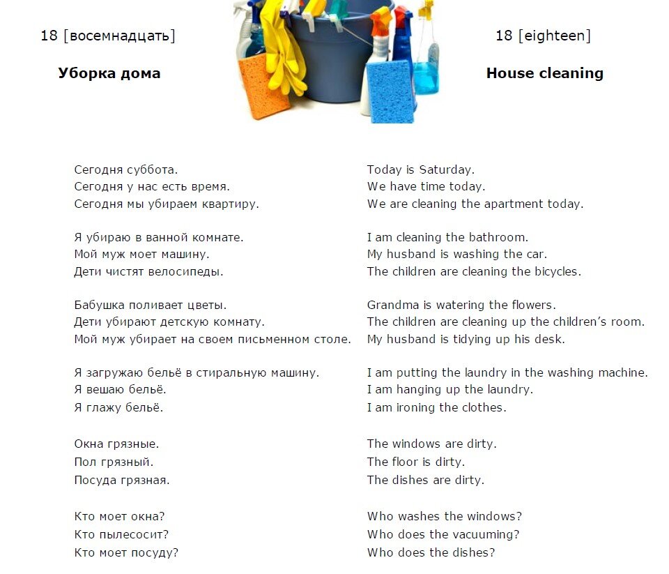 Английский язык. Урок 17. Добрый день! Продолжим изучение английского языка. Английский язык. Урок 18. 18 (восемнадцать) - 18 (eighteen) Уборка дома - House cleaning Сегодня суббота. - Today is Saturday. Сегодня у нас есть время. - We have time today. Сегодня мы убираем квартиру. - We are cleaning the apartment today. Я убираю в ванной комнате. - I am cleaning the bathroom. Мой муж моет машину. - My husband is washing the car. Дети чистят велосипеды. - The children are cleaning the bicycles. Бабушка поливает цветы. - Grandma is watering the flowers. Дети убирают детскую комнату. - The children are cleaning up the children’s room. Мой муж убирает на своём письменном столе. - My husband is tidying up his desk. Я загружаю белье в стиральную машину. - I am putting the laundry in the washing machine. Я вешаю бельё. - I am hanging up the laundry. Я глажу белье. - I am ironing the clothes. Окна грязные. - The windows are dirty. Пол грязный. - The floor is dirty. Посуда грязная. - The dishes a