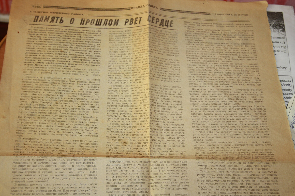 Память о прошлом рвет сердце начало окончание Вызвали председателя в район, на бюро. Вспомнили, что сын кулака, во вредительстве обвинили! Это после такого труда, когда он и дома не появлялся! Дожди прояснили обстановку. В соседних колхозах хлеб сгнил в снопах. А наши молотили под навесом и сдавали. Но районный план сдачи хлеба затрещал и опять в наш колхоз начальник за начальником. Колхоз выполнил план, потом еще пол-плана. Вновь приезжают и дают дополнительный. Папка отказался сдавать. - Собирайте собрание, разъясняйте людям. Я не могу оставить их без хлеба, они год работали! Ведь вы-то каждый месяц деньги получаете, а колхозник надеется получить что-то раз в году! Это было примерно в 1953 году. Собрали собрание, а люди молчат. Боятся сказать. И папка мой сломался! - Зачем я за всех глотку рву? Что, мне больше всех надо? Я в любом месте кусок хлеба заработаю. И уехал. Дали ему отпуск за все годы, или