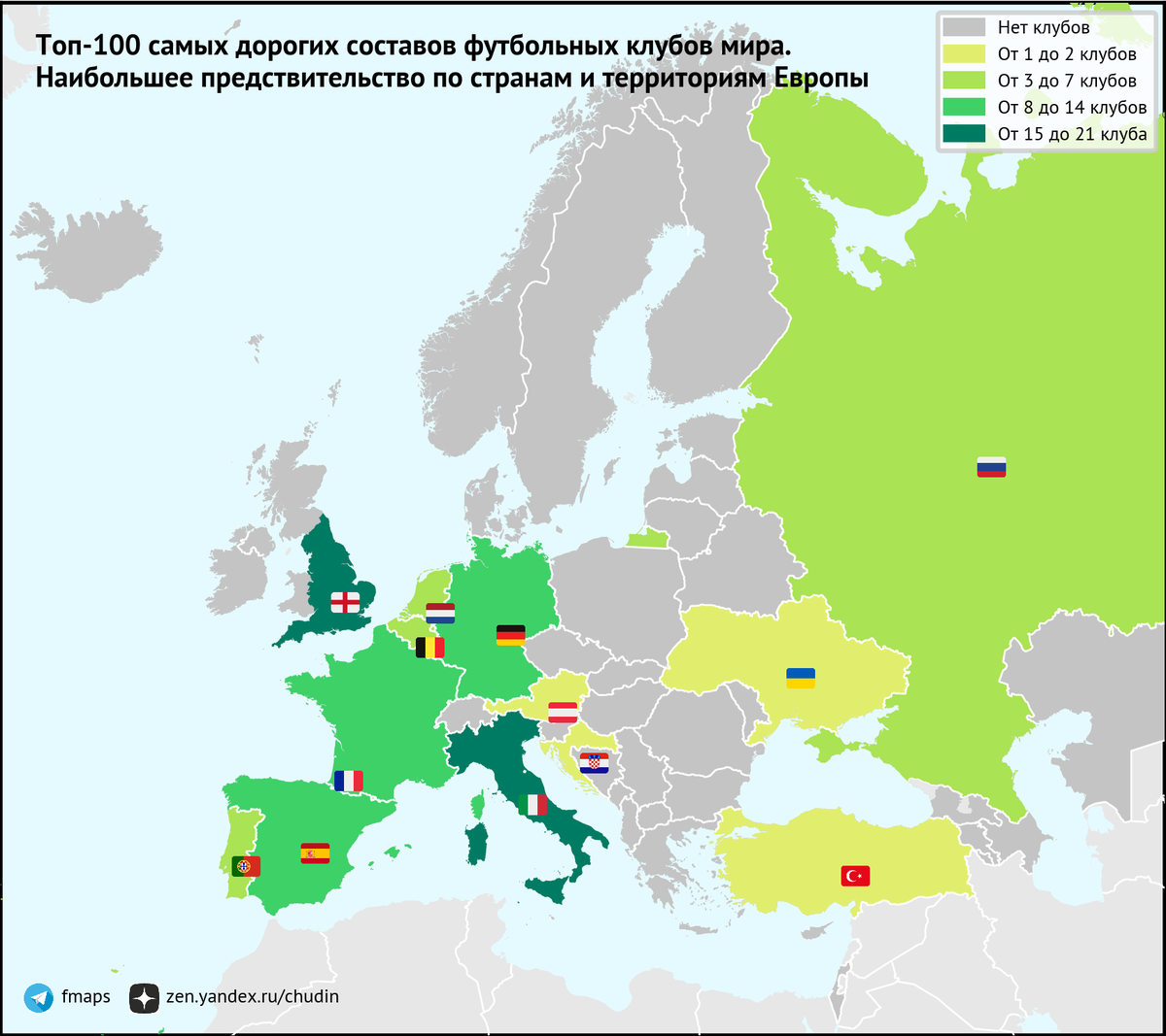 100 самых дорогих составов футбольных клубов мира и их расположение в Европе