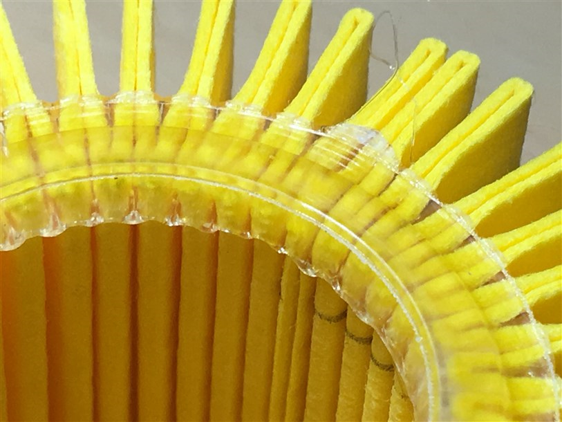 - Фильтрующий элемент проклеен менее качественно, видны подтеки клея.
