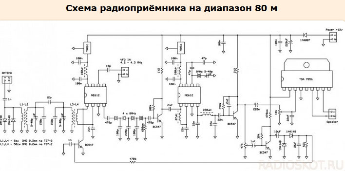 Вот радиоприемник для прослушивания любительских КВ станций, который можно смело порекомендовать людям, не имеющим опыта в создании таких схем. Представленный приемник предназначен для приема 80-метрового диапазона и SSB-излучения. Кроме того, с его помощью могут быть получены карты погоды, вещающие на частоте около 3,9 МГц. Приемник оснащен АРУ, необходимой для комфортной работы. Схема радиоприёмника на 80м Фильтрующие конденсаторы кварцевого фильтра были выбраны по следующей формуле: Значения элементов не являются критичными, допустимы довольно большие отклонения (это неприменимо к конденсаторам в резонансных цепях и в кварцевом фильтре). Ресивер работает сразу после сборки. Вам просто нужно настроить входной фильтр на максимальный сигнал и гетеродин. Генератор должен быть полностью экранирован и механически устойчив. Максимальное отклонение от принятого сигнала составляет около 150 Гц. Выше этого предела сигнал становится неразборчивым. Подключив обычный AM-детектор пер