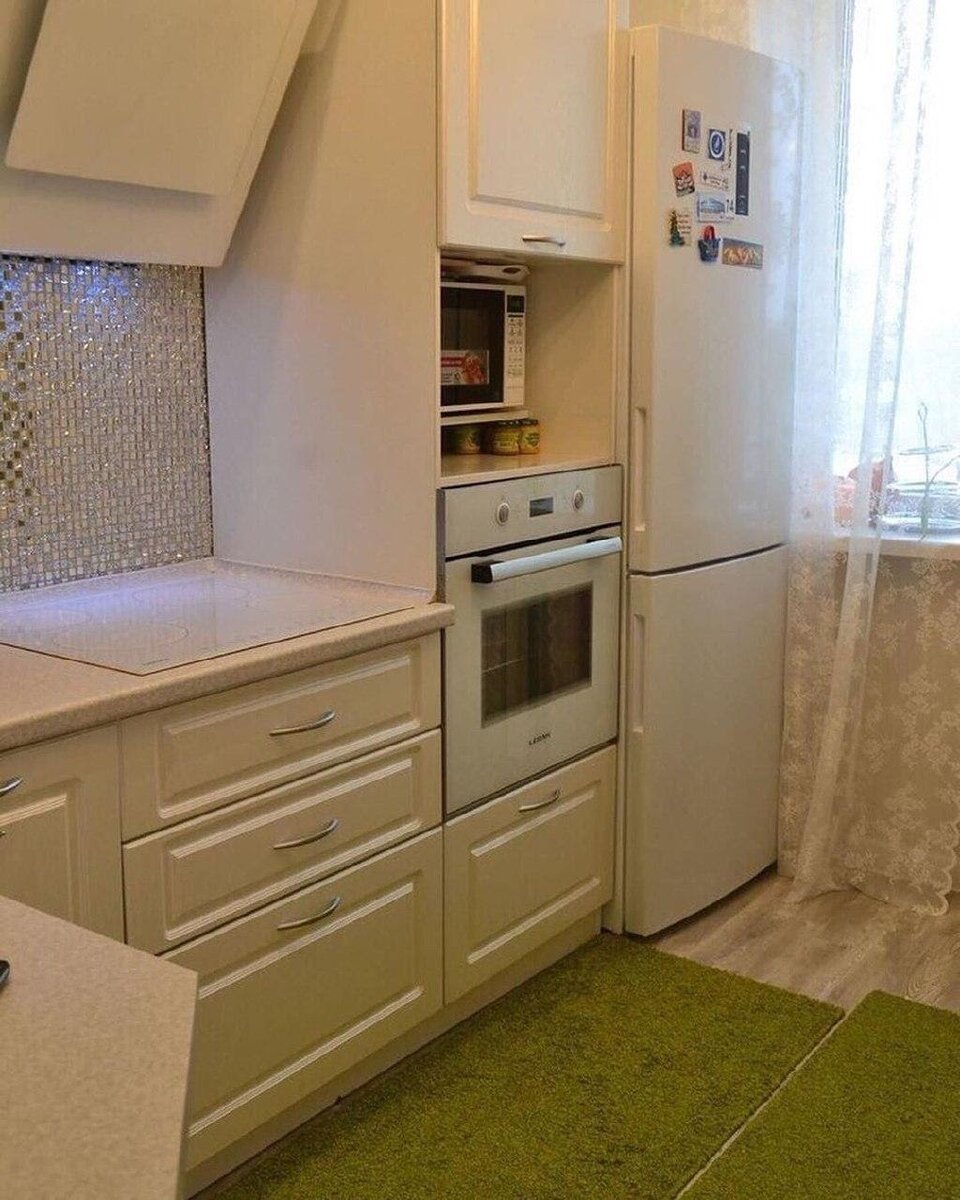 На фото ниже — три встройки одновременно, причём духовка расположена прямо над винным шкафом. Кажется, владельцы очень уверены в отличной теплоизоляции техники. Но выглядит симпатично. Кухня, кстати, не гигантская — чуть больше 6 квадратов.