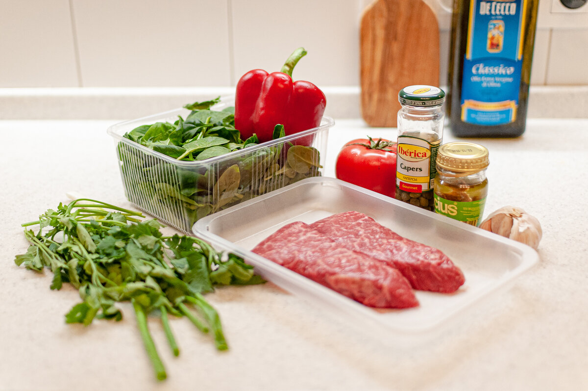К стейку не очень подходят классические гарниры: картошка, рис, макароны — получается слишком тяжело. Да и вообще про гарниры обычно никто не рассказывает — максимум, говорят о салатике. Поэтому рассказываю про отличный, лёгкий и простой гарнир к стейкам. На двоих нам понадобится: любимый стейк, советую попробовать из пашины или шеи (у мираторга это Бавет и Денвер) большой помидор сладкий перец шпинат половинка луковицы пара зубчиков чеснока петрушка и зелёный лук каперсы анчоусы Заранее нарежьте овощи мелким кубиком, потому что сначала мы пожарим стейки, а потом быстренько обжарим овощи в той же сковородке. А чтобы стейки не остыли, пока мы будем жарить гарнир, нужно прогреть тарелки: в горячей воде, микроволновке или в духовке на минималках. Ну что, жарим стейки. Не забудьте их промокнуть, чтобы поверхность была максимально сухой. Тогда получится красивая корочка. Ну и жарим с помощью термометра (советую икеевский). Ждём пока внутри будет 50–52°С. Когда стейки будут готовы, кладём н