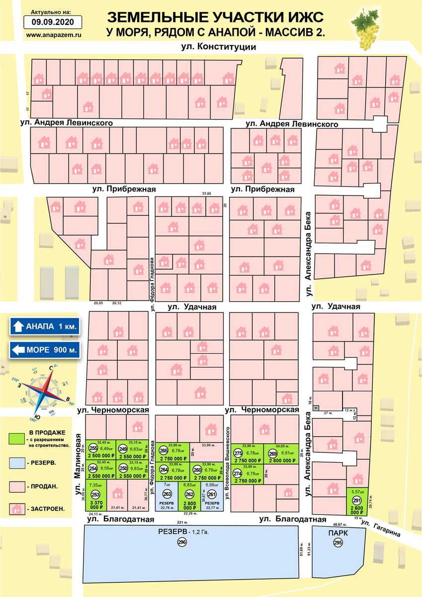 Представляем вашему вниманию цены на наши земельные участки ИЖС актуально - на 9 сентября 2020 года: В виде таблицы: Фото с квадрокоптера земельные участки ИЖС - ТСН "Виноградный": Для того чтобы узнать подробную информацию о наших земельных участках ИЖС, переходите на страницу "ВАША ЗЕМЛЯ": https://anapazem.ru/ Или обращайтесь за дополнительной информацией телефонам в офис собственника земельных участков: +7 988 134 11 99 - Александр Высоцкий alex@anapazem.ru